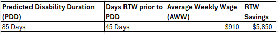 RTW Savings = (Days RTW prior to PDD) X (AWW)